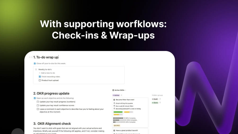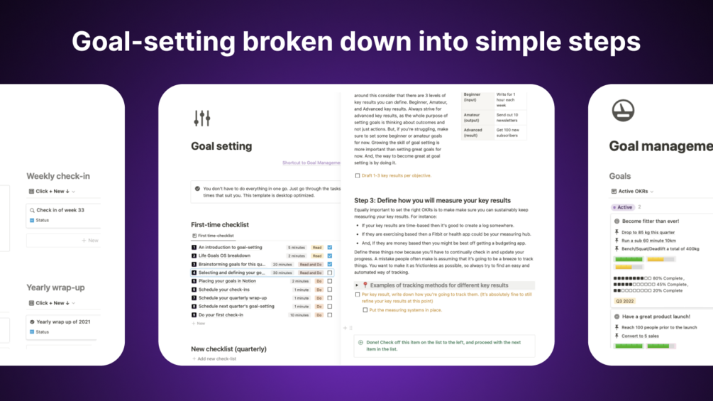 - A recurring checklist for setting and achieving your goals each quarter